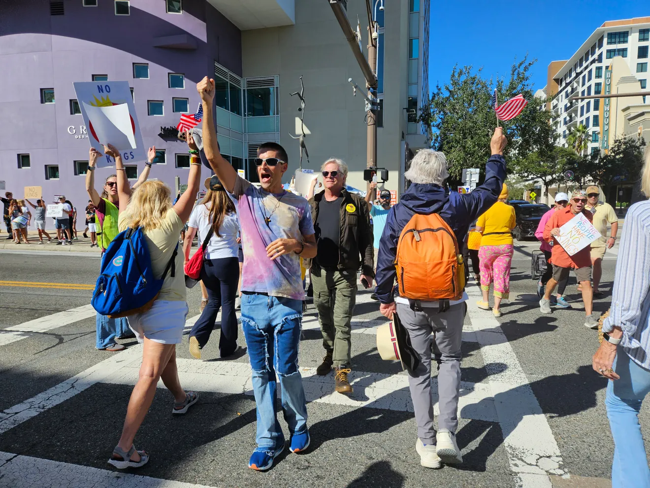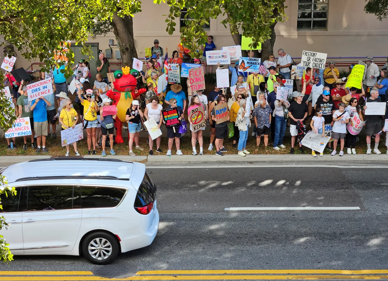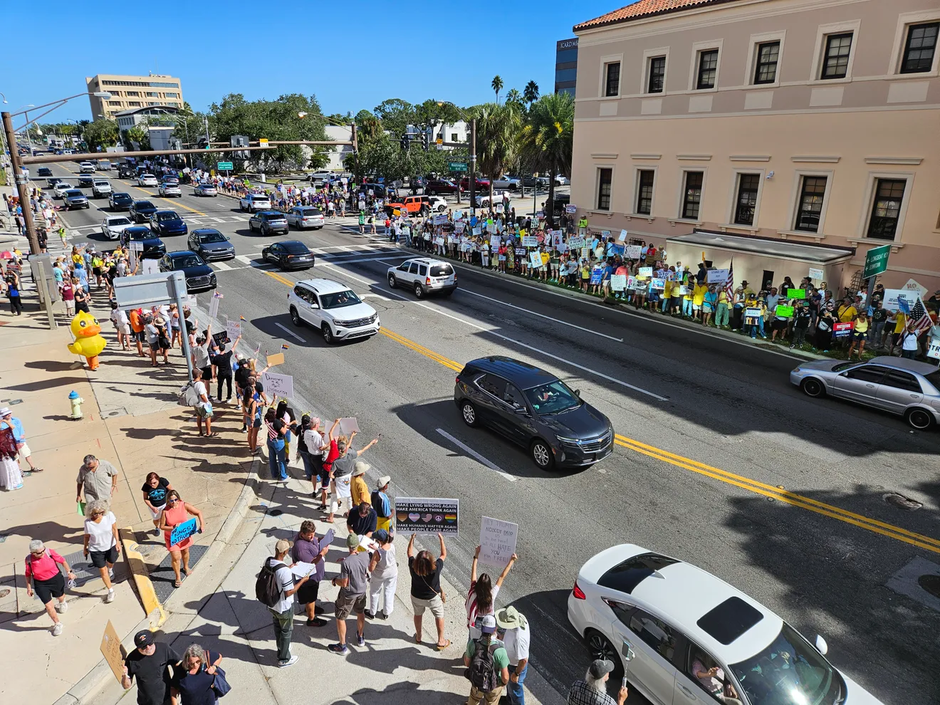 An estimated 3,000 people gather for a “No Kings” protest in downtown Sarasota, Florida, on Oct. 18, 2025, beginning at Payne Park and moving west toward Main Street and Ringling Boulevard. Protesters nationwide are expected to gather at more than 2,500 locations to rally against Donald Trump, which organizers predict could be the largest single-day protest in modern U.S. history.