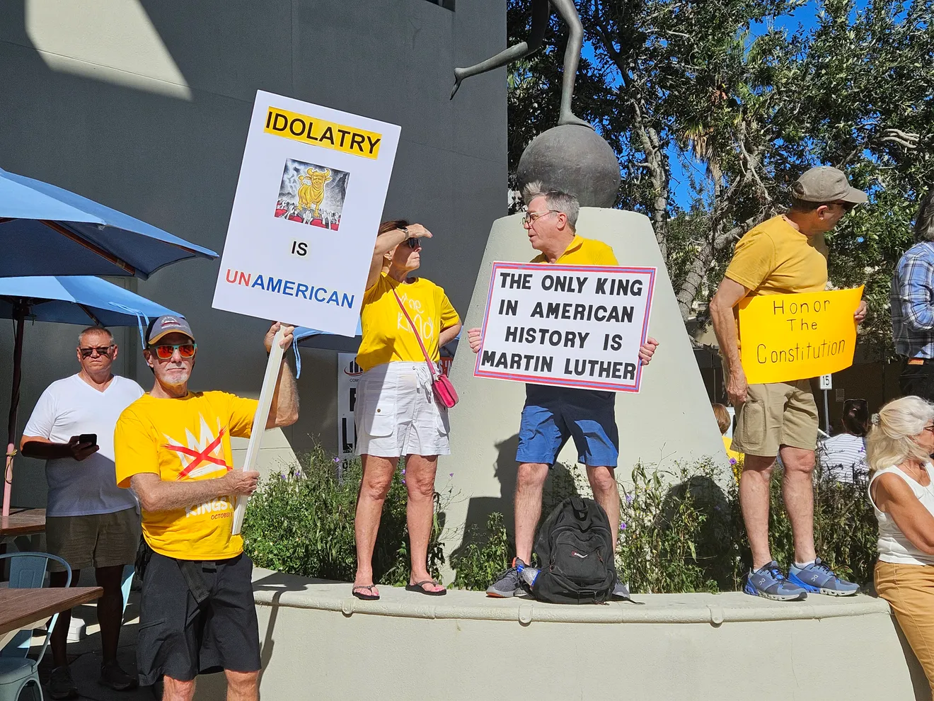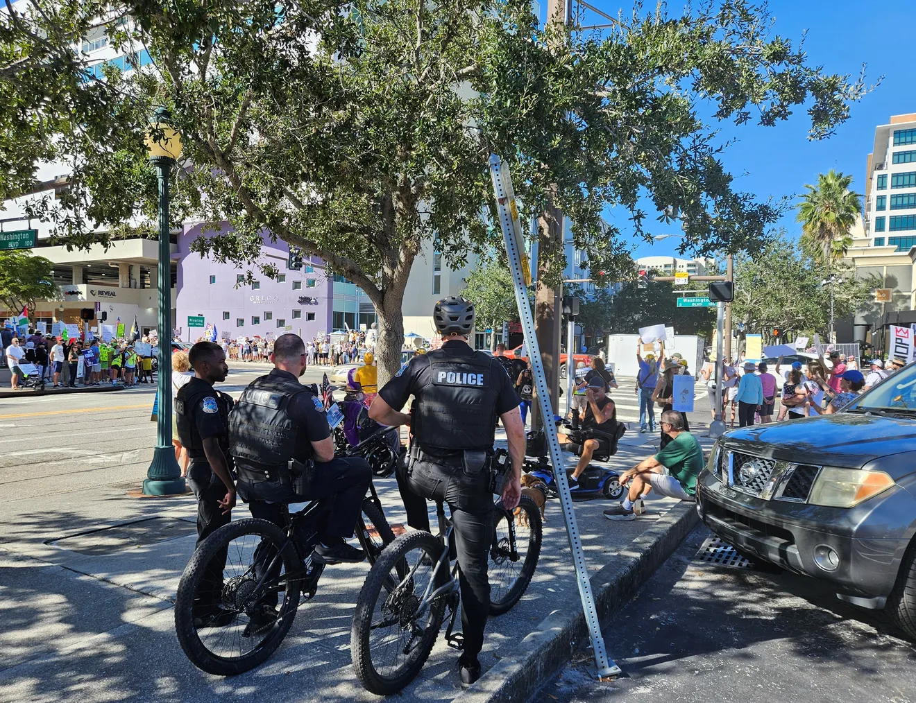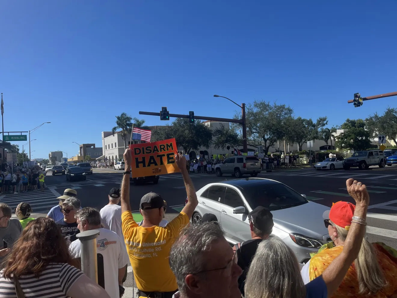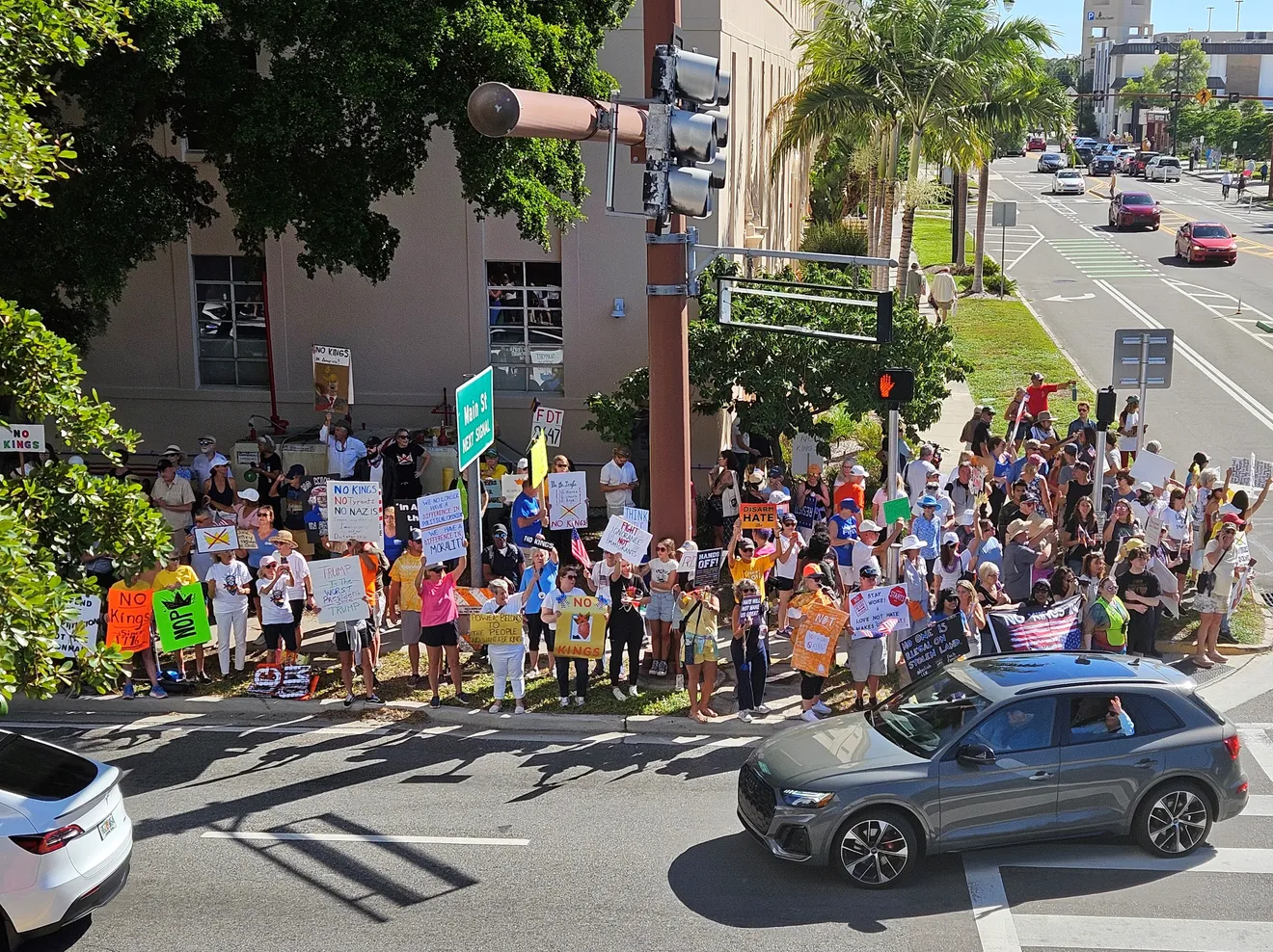 An estimated 3,000 people gather for a “No Kings” protest in downtown Sarasota, Florida, on Oct. 18, 2025, beginning at Payne Park and moving west toward Main Street and Ringling Boulevard. Protesters nationwide are expected to gather at more than 2,500 locations to rally against Donald Trump, which organizers predict could be the largest single-day protest in modern U.S. history.